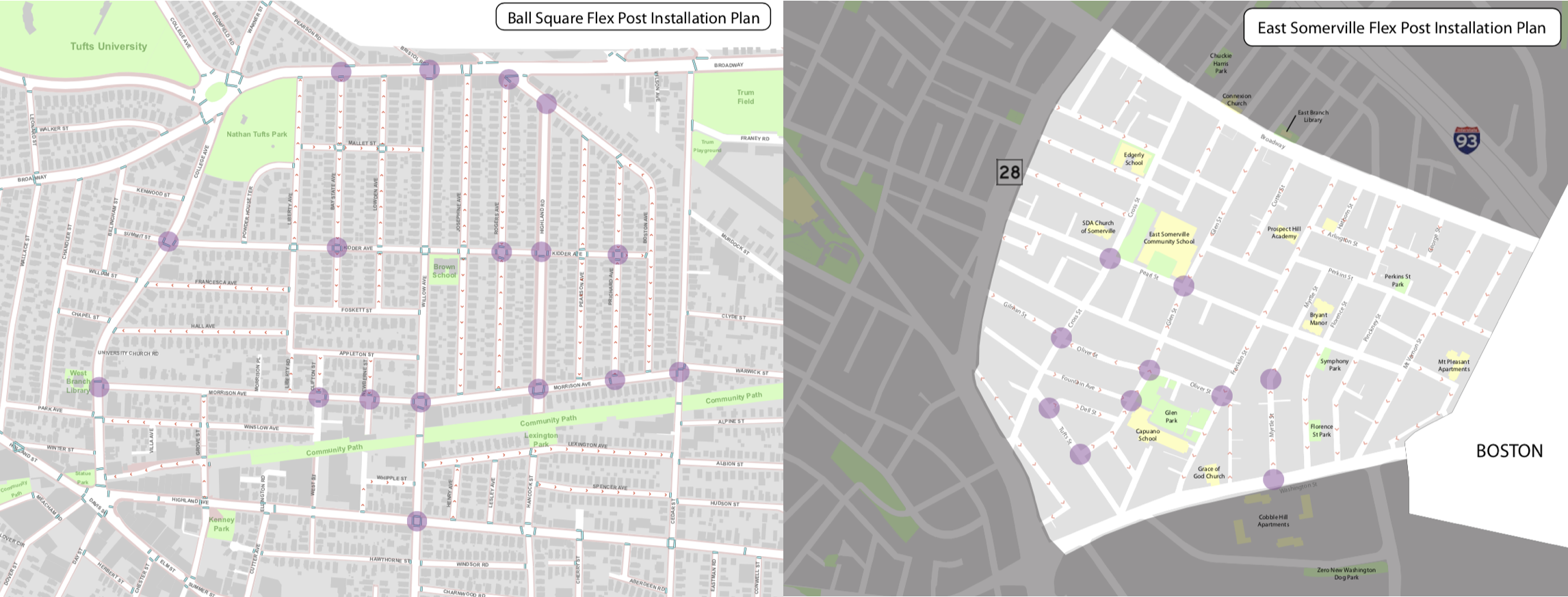 In anticipation of increased traffic on neighborhood streets due to the closure of the Broadway and Washington St. bridges as part of the ongoing Green Line Extension project, the City has deployed flex posts as a quick and affordable method of traffic calming. These are intended to slow vehicles down, improve safety at crosswalks and intersections, and hopefully deter commuters from using these streets.