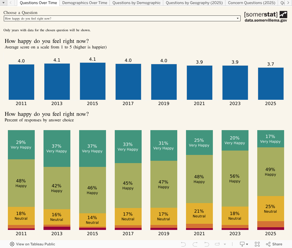 The Somerville Happiness Survey measures residents’ overall happiness and satisfaction with various aspects of life in Somerville. SomerStat has conducted the survey every two years since 2011. Questionnaires, data, and visualizations from 2011 to 2025 surveys are available on Somerville's Open Data Portal