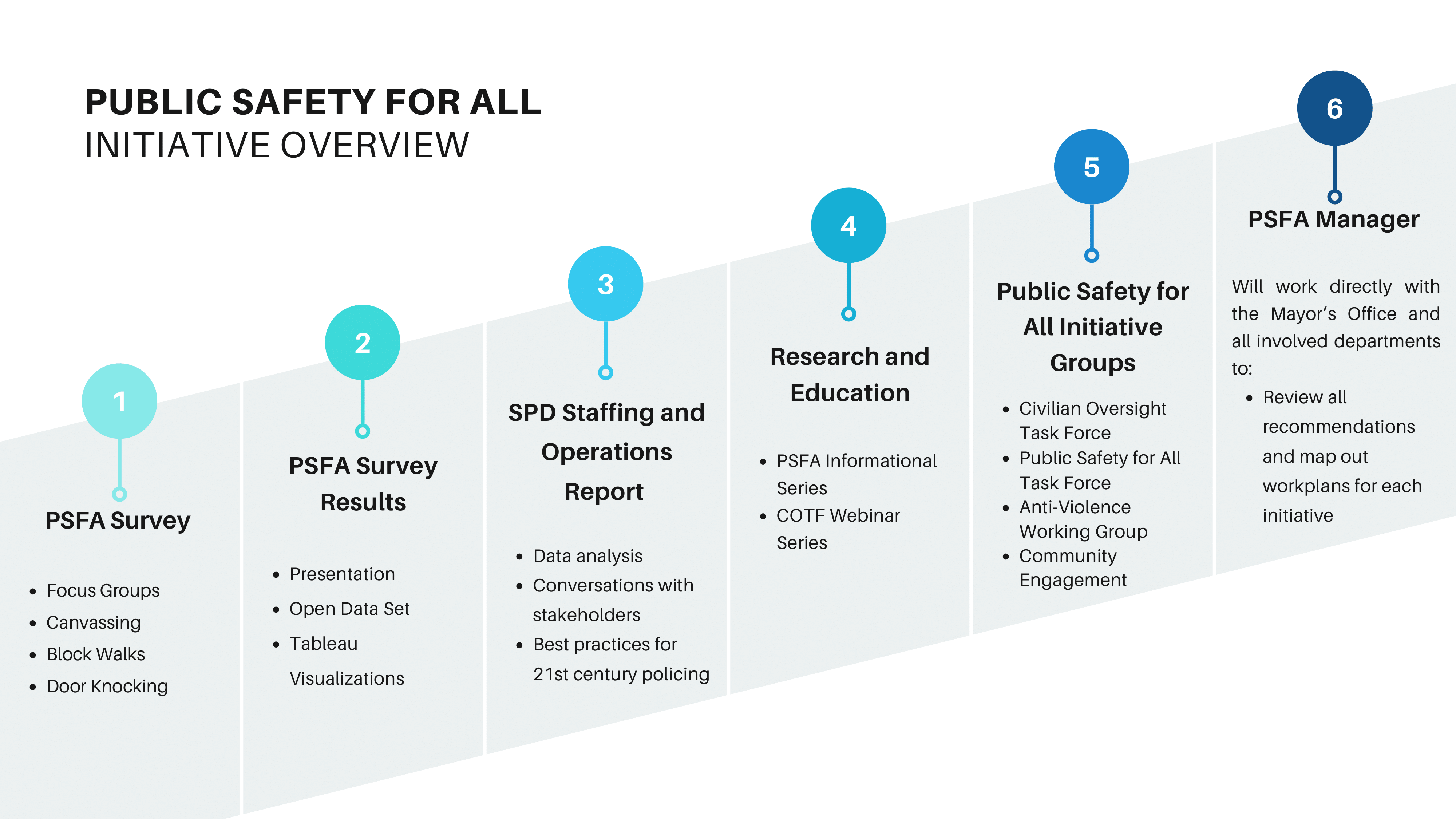 The Public Safety for All initiative embodies the values of equity, transparency, accountability, innovation, and social justice. The vision of the combined efforts of the PSFA initiative is to have a tailored public safety system that encompasses the current needs of this diverse community while intentionally thinking about prevention, intervention, and after-care.